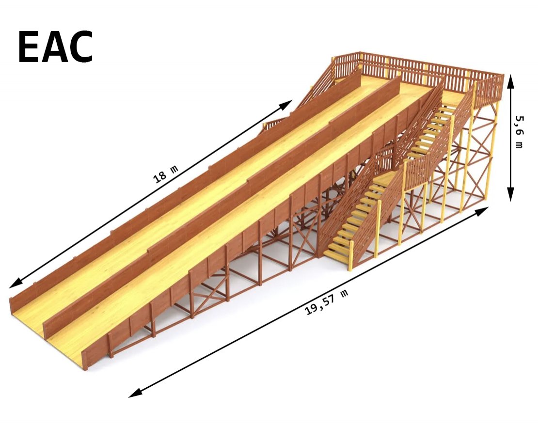 Два ската длиной по 18 метров и широкие лестницы позволяют одновременно кататься целой компании детей.