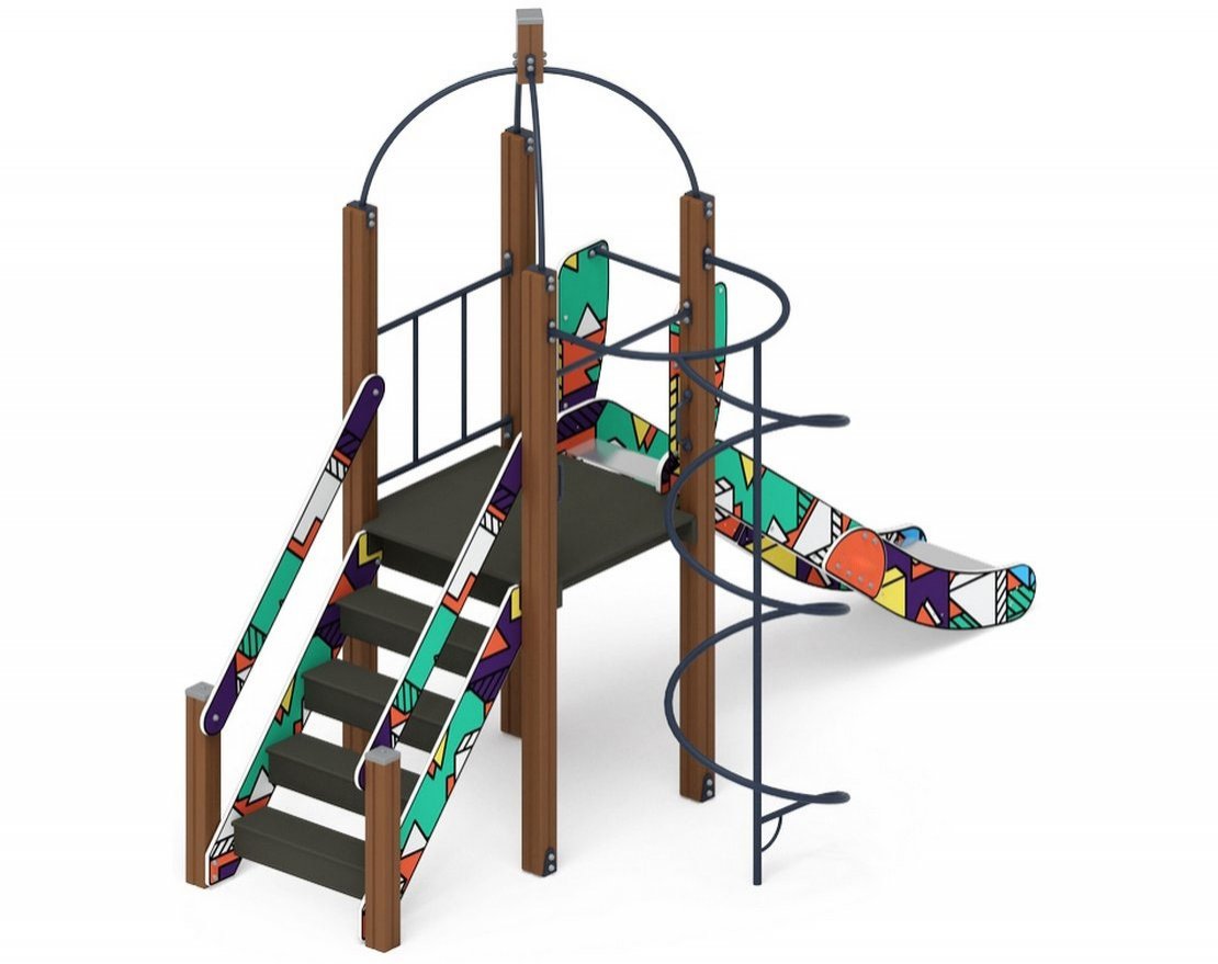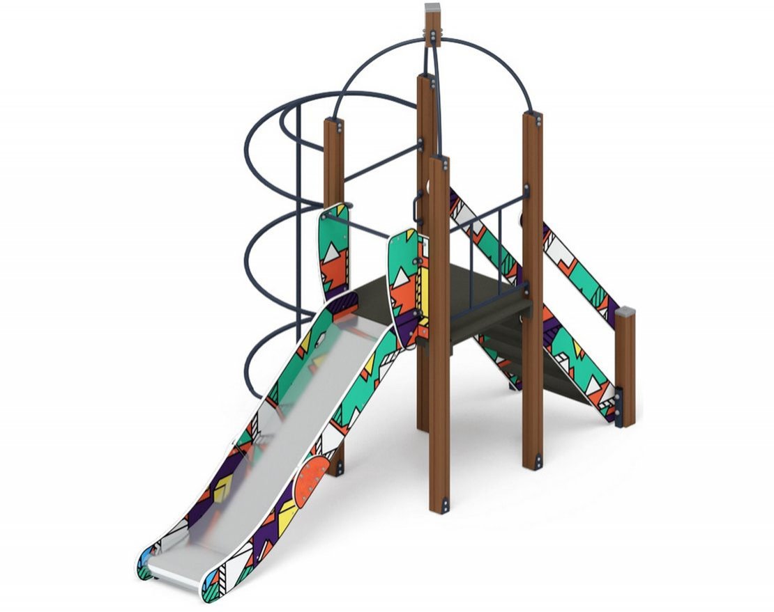 Скат горки шириной 530 мм, выполнен из нержавеющей стали t 1,5 мм, - цельного листа, борта выполнены из влагостойкой фанеры толщиной 24 мм, кромки фанеры тщательно шлифованы, борта окрашены при помощи УФ печати, принт –в стиле «Геометрия»- основной цвет принта – бирюзовый, на нем расположены геометрические фигуры, различных цветов- белого, красного, фиолетового, зеленого, голубого, желтого цвета. Ограждения стартового участка горки, выполнены из влагостойкой фанеры толщиной 18 мм. Опорный каркас горки выполнен из профиля 40х25 и труб диаметром 32 мм (металл имеет плавные радиусы и тщательную обработку швов, покрыт порошковой краской). Размер горки в плане 530х 2270х1200(h).
