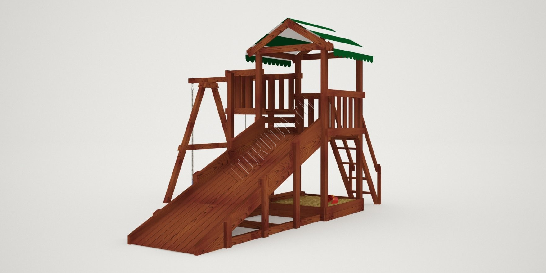 Также в модели есть еще один дополнительный канат для полноценного лазания – он расположен слева от качелей. Для любителей более спокойных игр предусмотрена песочница с удобной лавочкой для игральных принадлежностей.